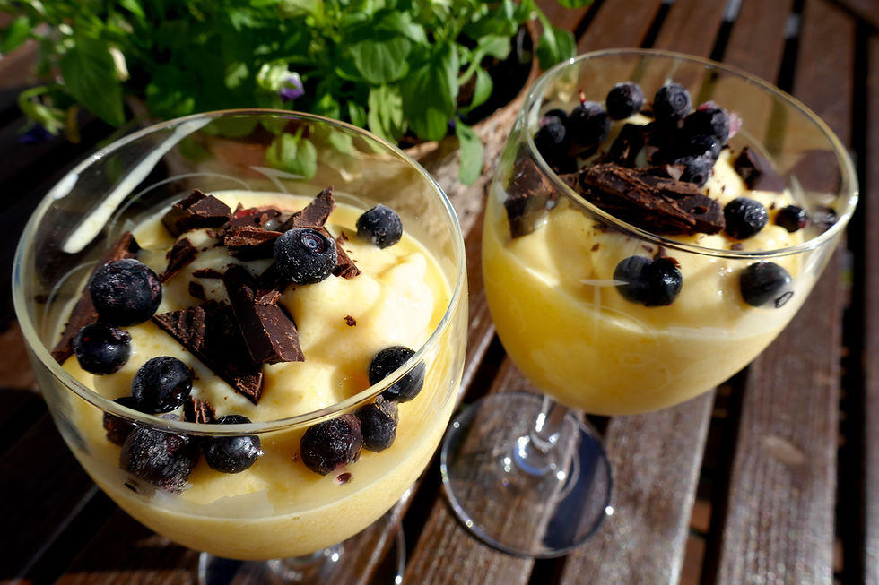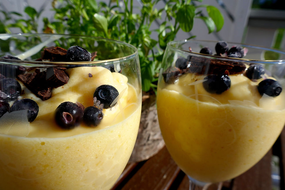 Jeg brukte to hele, modne mangoer, ca 380 gram yoghurt naturell, litt sukrin melis og litt sitronsaft. Smak til ;) Kutt opp mangoen i biter og legg i fryseren til frosne. Bland deretter alle ingredienser med stavmikser og servèr! Jeg toppet med litt blåbær og mørk sjokolade.