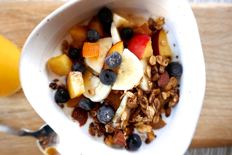 I disse sommerdager passer det ekstra godt med en god frokostskål med frisk frukt, granola og yoghurt. Synes ikke du? Jeg lagde granola i går og det ble frokosten min i dag. Topp med det du vil, her har jeg toppet med tørkede aprikoser, litt banan, blåbær og nektarin.